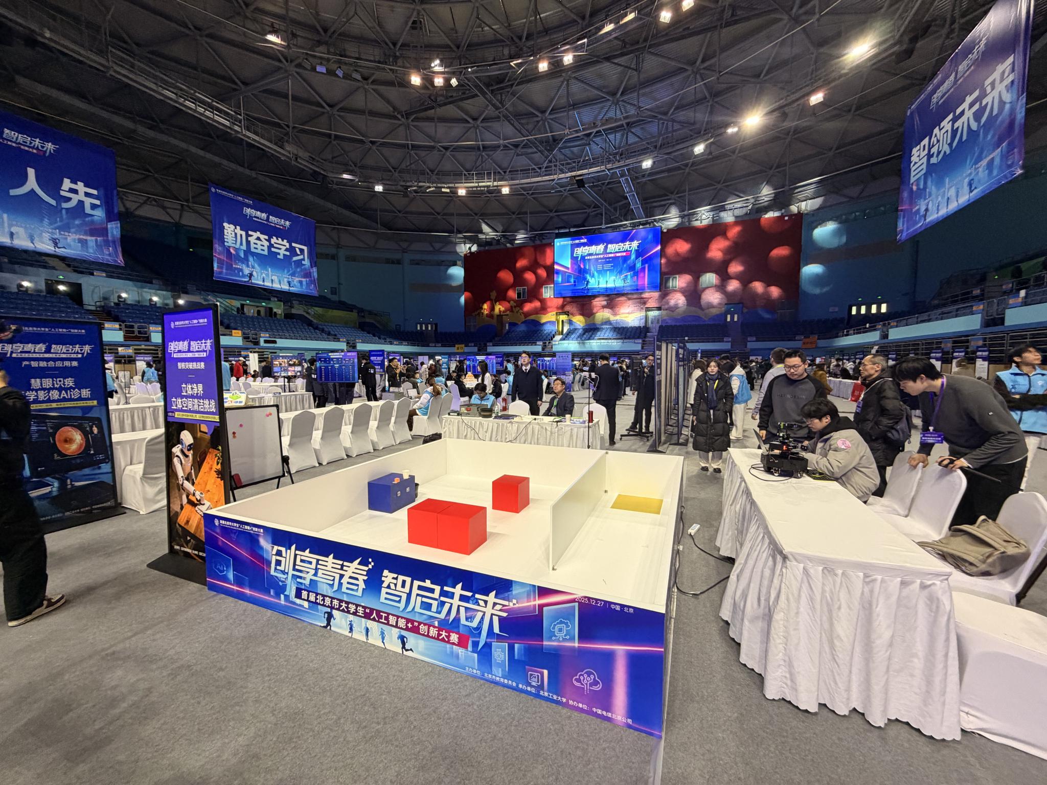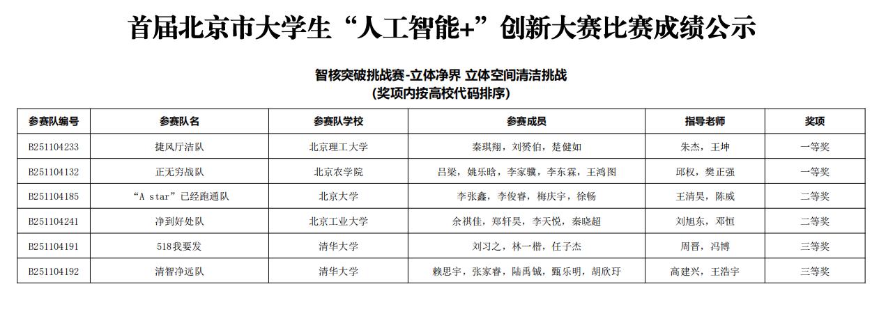 2025年12月27日,首届北京市大学生“人工智能+”创新大赛在北方工业大学举行。北京农学院智能科学与工程学院学生团队在比赛中表现良好,在智核突破挑战赛赛题四“立体净界——立体空间清洁挑战”中取得一等奖。