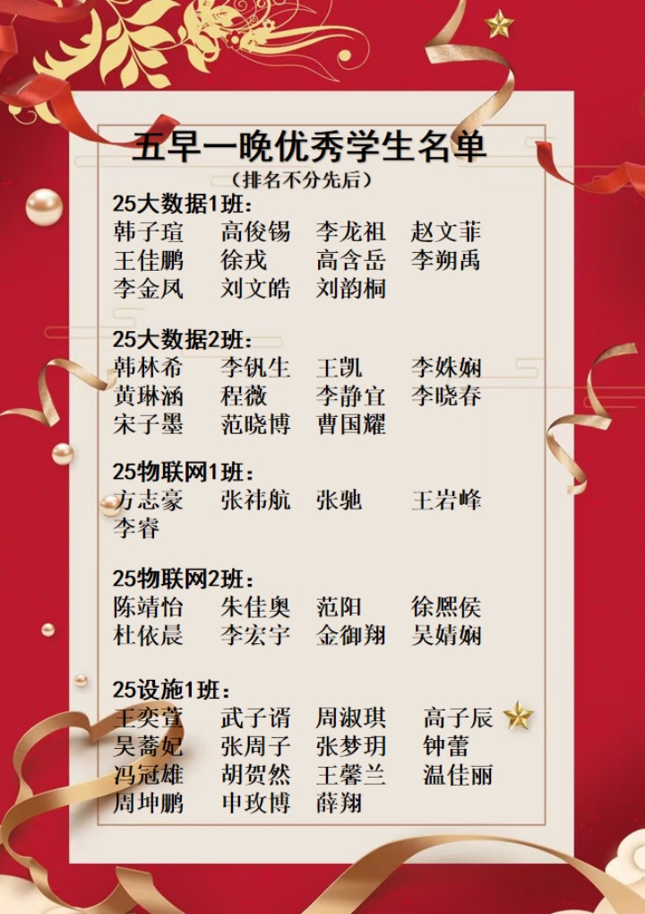 为进一步加强学风建设,营造勤学善思、积极向上的学习氛围,本学期以来,智能科学与工程学院持续推进“五早一晚”学习制度落实。在执行过程中,涌现出一批自觉性强、坚持性好、示范作用突出的优秀同学。