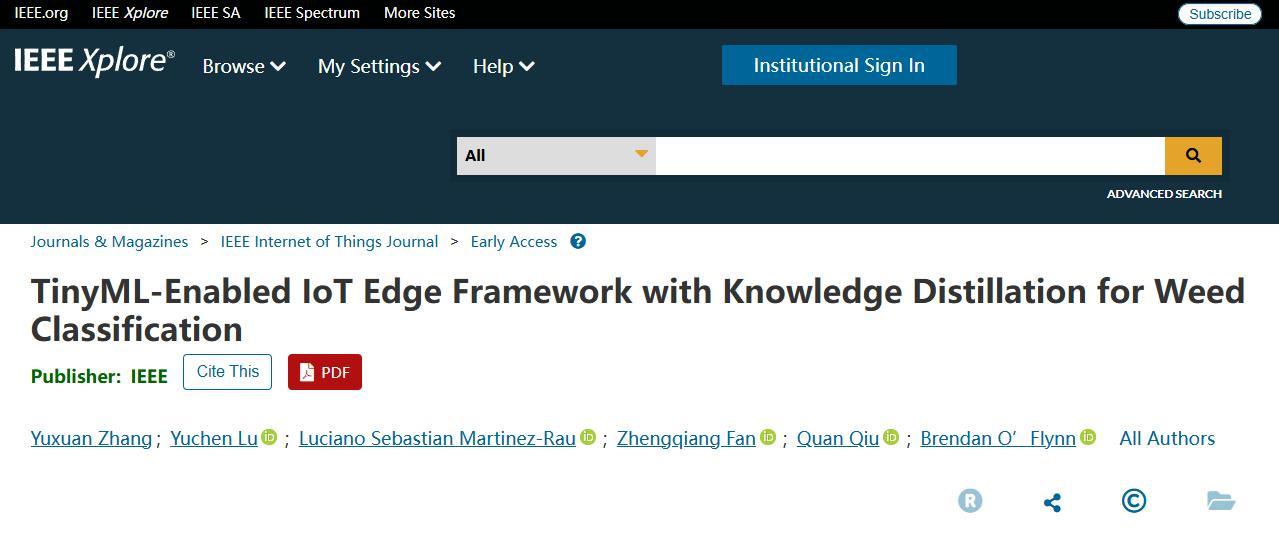 近日,北农智能学院物联网系青年教师张宇轩与邱权教授等人在国际物联网领域顶级期刊IEEE Internet of Things Journal在线发表题为“TinyML-Enabled IoT Edge Framework with Knowledge Distillation for Weed Classification”的研究论文。该研究面向农业物联网中的杂草识别问题,提出了一种基于TinyML的边缘智能框架,为农业机器人在资源受限环境中的高效运行提供了重要技术支撑。
